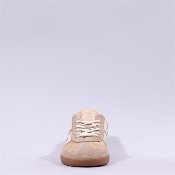 The upper boasts a light and soft nylon material, elegantly complemented with refined goat suede details. This combination not only enhances the trainer's appearance but also ensures durability.