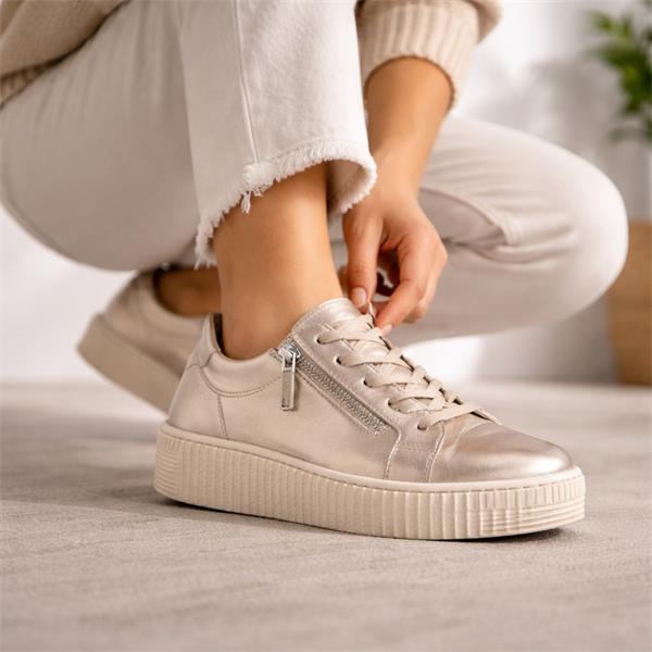 Whether you're running errands or enjoying a casual day out, these trainers offer the perfect blend of style and practicality. Elevate your footwear collection with the Gabor Twin Zip Platform Trainer Wisdom in metallic leather.