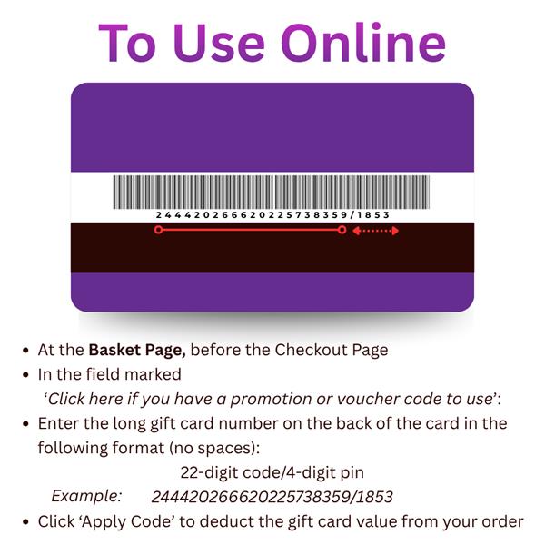 • To redeem the Gift Card you must enter your Unique Gift Voucher Code which appears on your Gift Voucher at the checkout in the box labelled "Apply Code".