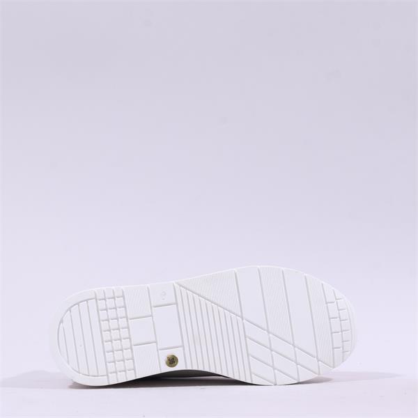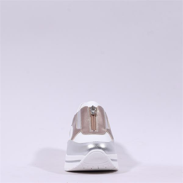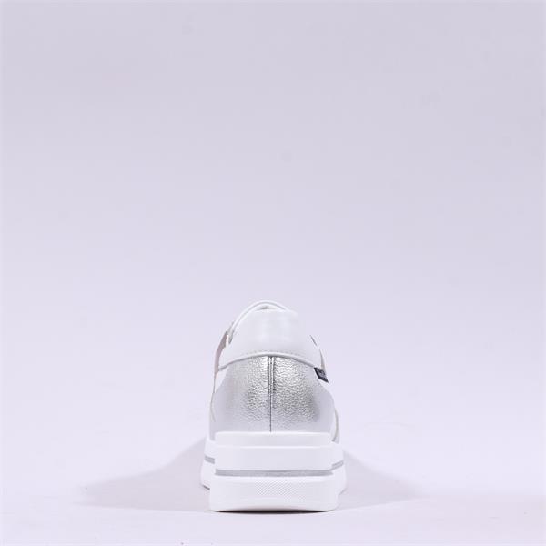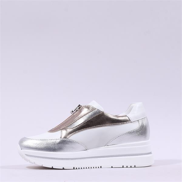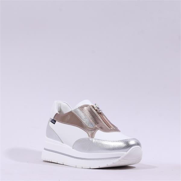 Contemporary and refined, this platform slip-on sneaker combines sporty comfort with elevated style. Crafted from smooth laminated leather, it features contrasting laminated panels and subtle metallic accents that add a modern, luminous touch to the design.