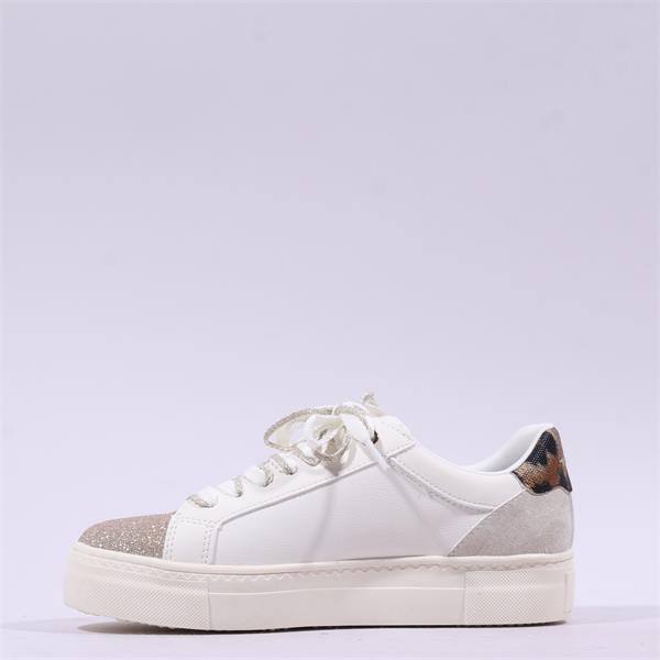 Designed with a 35mm platform sole, these trainers offer a subtle lift while ensuring stability and support. The chic gold sparkle toe, complemented by elegant gold accents, elevates your look, while the striking leopard print heel collar adds a bold touch of flair.
